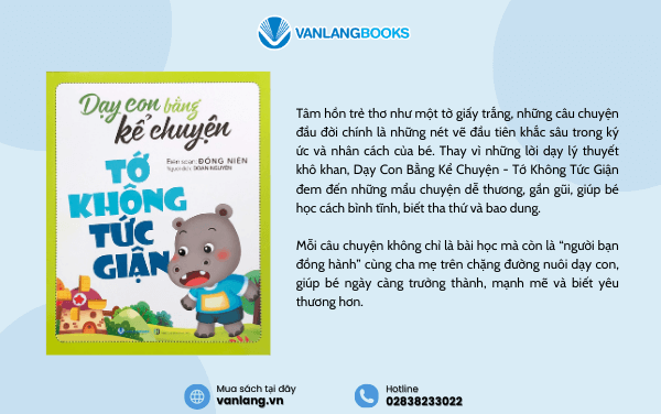 Trong hành trình lớn khôn của trẻ, việc quản lý cảm xúc, đặc biệt là sự tức giận, là một kỹ năng vô cùng quan trọng. Với mong muốn mang đến phương pháp giáo dục tinh tế và hiệu quả, Vanlangbooks tự hào giới thiệu cuốn sách "Dạy Con Bằng Kể Chuyện - Tớ Không Tức Giận". Ấn phẩm là người bạn đồng hành cùng cha mẹ, giúp con học cách bình tĩnh và bao dung. Khám phá ngay tại Vanlang.vn!