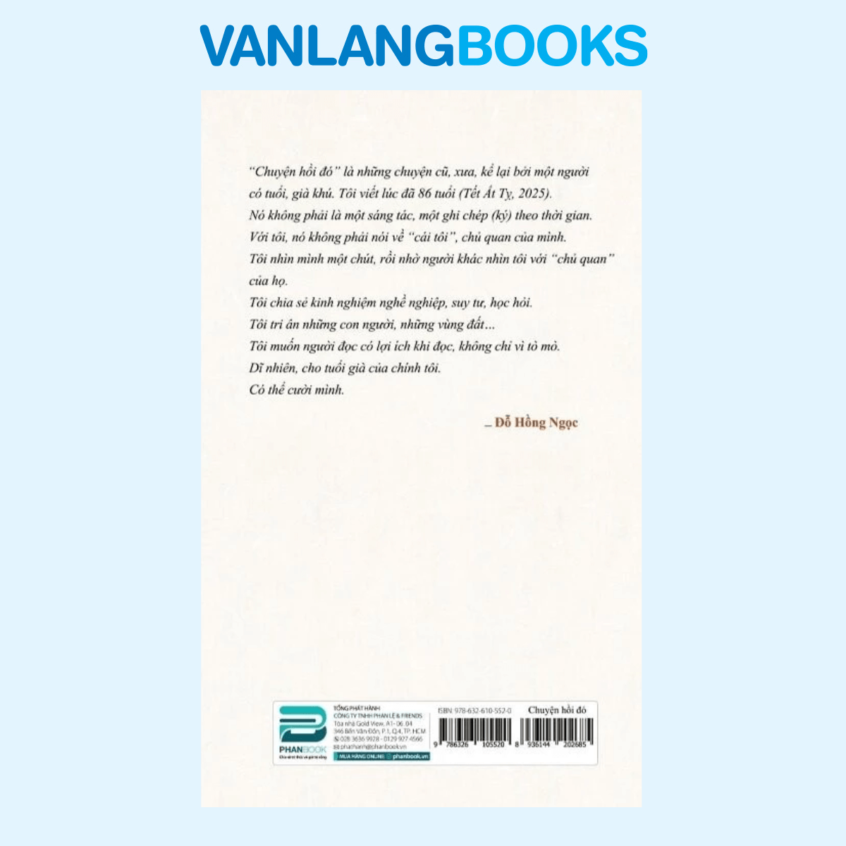 “Chuyện Hồi Đó” là tập sách kể lại những kỷ niệm, trải nghiệm và suy tư của tác giả Đỗ Hồng Ngọc ở tuổi 86 (Tết Ất Tỵ 2025). Cuốn sách không phải là một sáng tác hư cấu hay ghi chép theo thời gian mà là những câu chuyện đời thực được nhìn nhận cả từ góc nhìn của chính tác giả lẫn những người xung quanh. Qua từng trang sách, tác giả chia sẻ kinh nghiệm nghề nghiệp, những bài học quý giá và suy tư về cuộc sống, đồng thời tri ân những con người và vùng đất đã gắn bó với ông. Cuốn sách mang đến giá trị nhân văn, vừa giúp độc giả hiểu sâu hơn về tác giả, vừa mang đến những bài học sống hữu ích. Với giọng văn chân thành và dí dỏm, độc giả có thể cười cùng tác giả và đồng cảm với những trải nghiệm của ông.