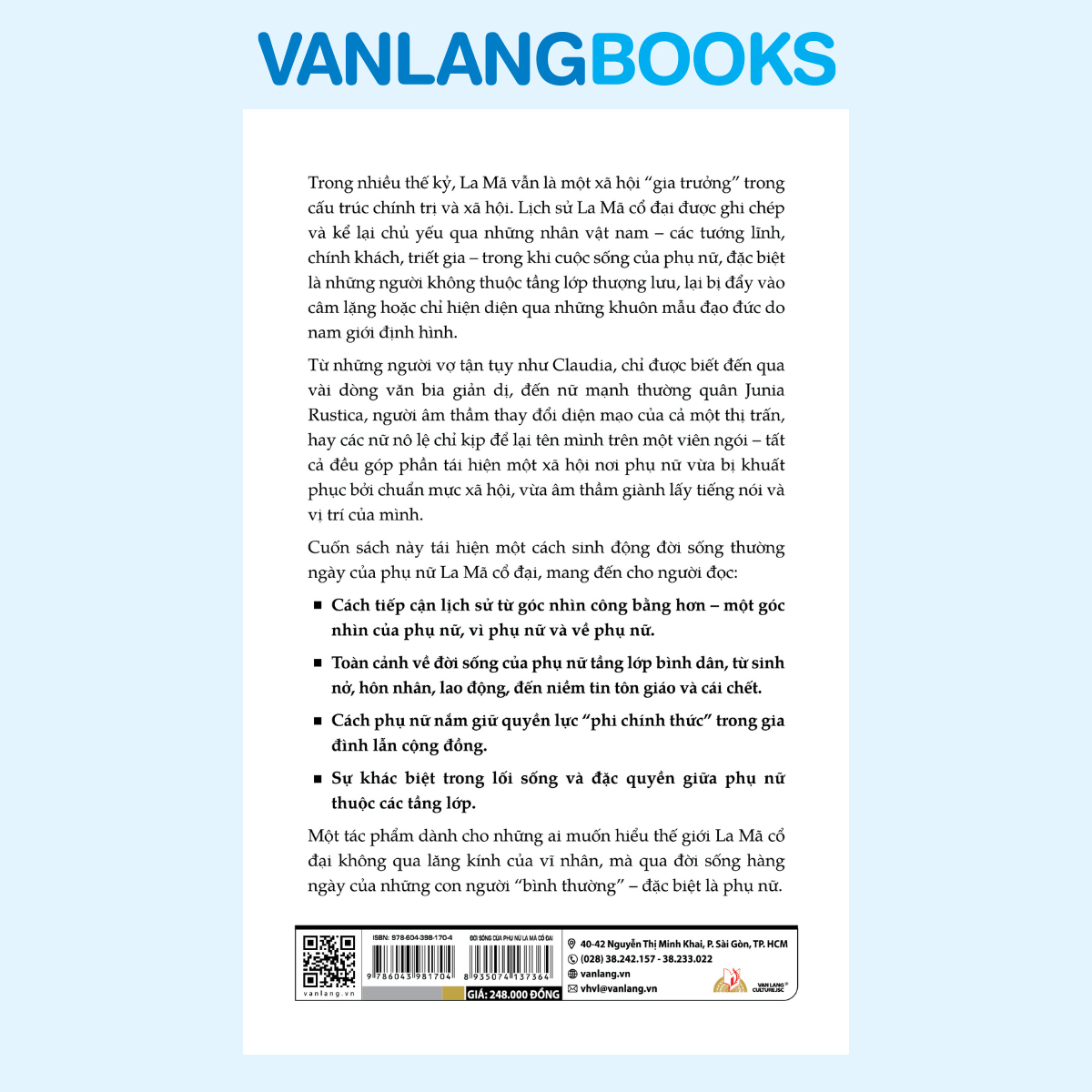 Đời sống của phụ nữ La Mã cổ đại của Sara Elise Phang đưa độc giả trở về quá khứ, tái hiện sinh động đời sống thường ngày của những người phụ nữ La Mã — từ vợ hiền, mạnh thường quân đến nữ nô lệ — những con người lặng thầm nhưng không hề vô hình.