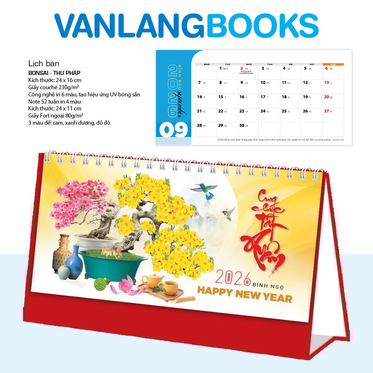 Chào đón năm mới với Lịch Bàn 1 lò xo chữ A Vanlangbooks 2026 chủ đề Bonsai & Thư Pháp, một cuốn lịch mang đậm nét văn hóa Á Đông, kết hợp vẻ đẹp tinh tế của cây cảnh và sự uyển chuyển của nghệ thuật thư pháp. bạn có thể dễ dàng ghi chú và lên kế hoạch cho một năm bận rộn. Đây là người bạn đồng hành lý tưởng trên bàn làm việc, mang đến sự bình yên và tinh thần nghệ thuật mỗi ngày.