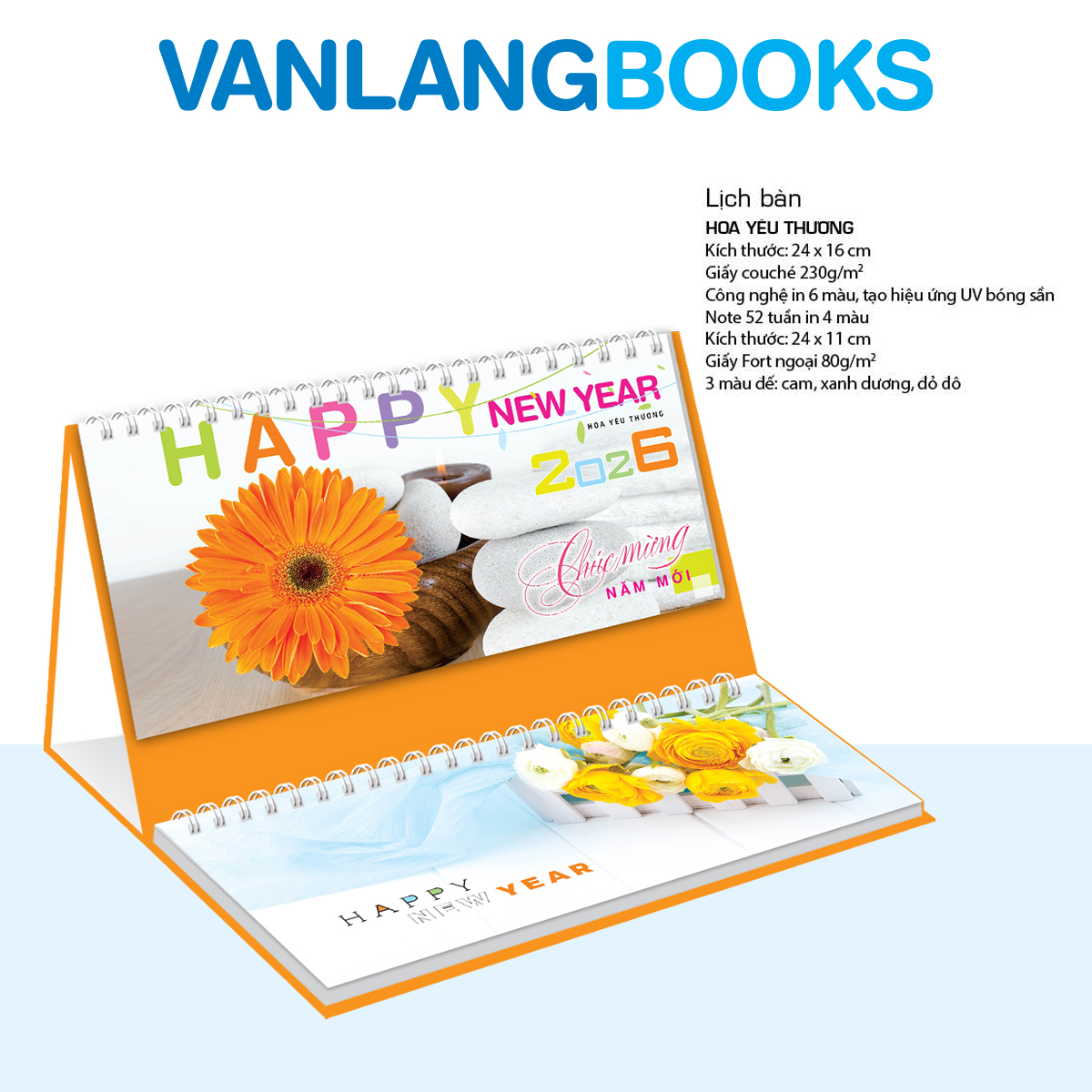 Chào đón năm mới với Lịch Bàn Vanlangbooks 2026 chủ đề Hoa Yêu Thương, một cuốn lịch tràn ngập những đóa hoa tươi thắm và những thông điệp ấm áp về tình cảm. Với phần note 52 tuần tiện dụng, bạn có thể dễ dàng ghi chú, lên kế hoạch cho một năm bận rộn. Đây là người bạn đồng hành lý tưởng trên bàn làm việc của bạn, mang đến vẻ đẹp và sự tươi mới mỗi ngày.