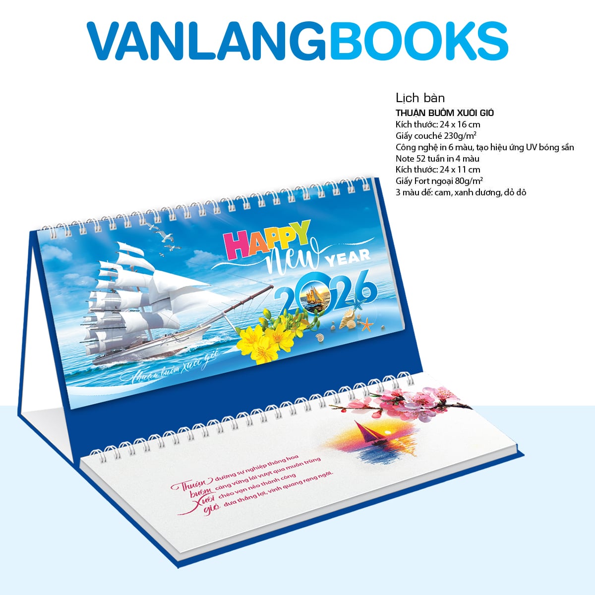 Chào đón năm mới với Lịch Bàn Vanlangbooks 2026 chủ đề Thuận Buồm Xuôi Gió, một cuốn lịch mang theo ý nghĩa của sự may mắn, thành công và hanh thông trong mọi công việc. Hình ảnh những cánh buồm căng gió vươn ra biển lớn sẽ truyền cảm hứng cho bạn mỗi ngày. Với phần note 52 tuần tiện dụng, bạn có thể dễ dàng ghi chú và lên kế hoạch cho một năm bận rộn. Đây là món quà tặng Tết vô cùng ý nghĩa cho bạn bè, đối tác hoặc người thân.