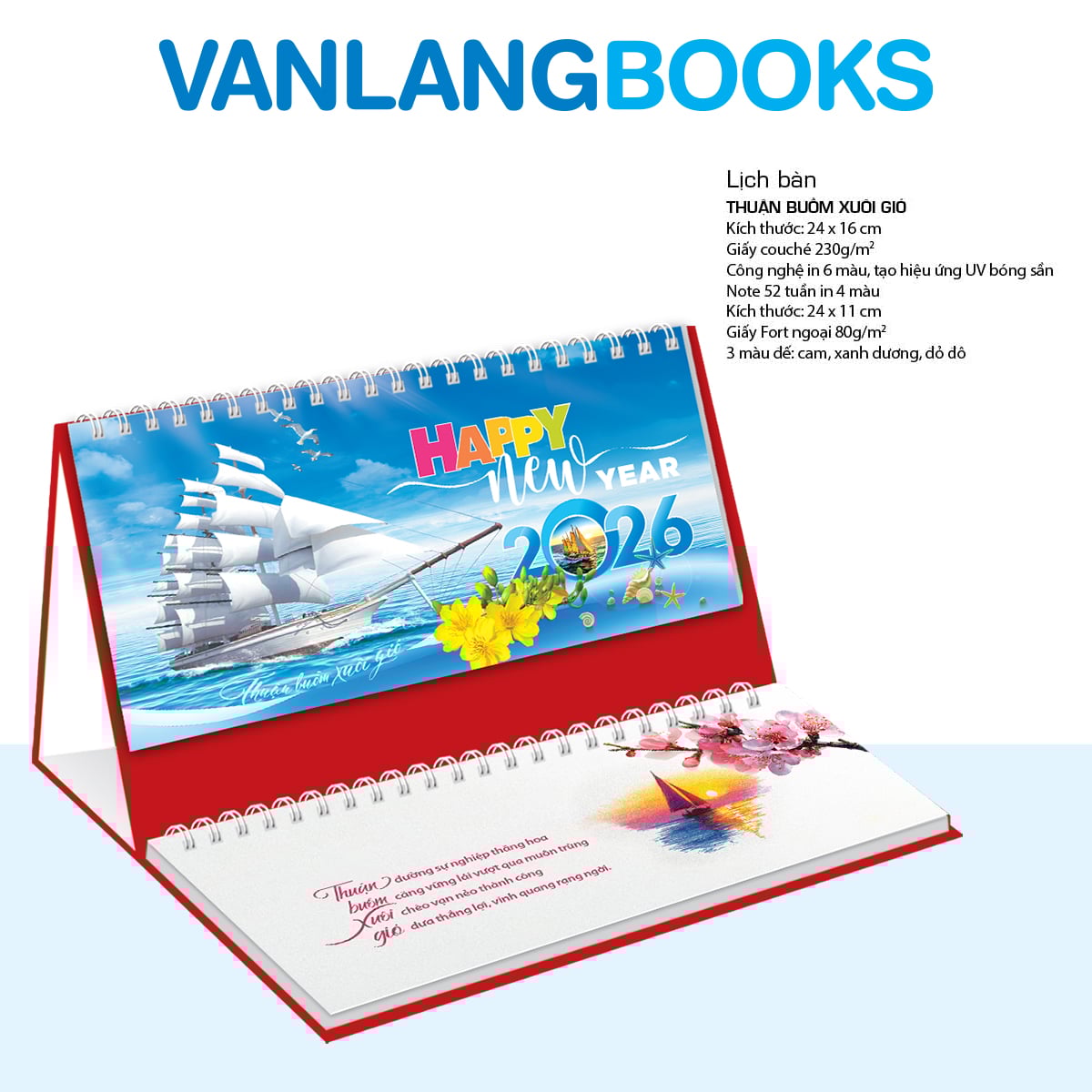 Chào đón năm mới với Lịch Bàn Vanlangbooks 2026 chủ đề Thuận Buồm Xuôi Gió, một cuốn lịch mang theo ý nghĩa của sự may mắn, thành công và hanh thông trong mọi công việc. Hình ảnh những cánh buồm căng gió vươn ra biển lớn sẽ truyền cảm hứng cho bạn mỗi ngày. Với phần note 52 tuần tiện dụng, bạn có thể dễ dàng ghi chú và lên kế hoạch cho một năm bận rộn. Đây là món quà tặng Tết vô cùng ý nghĩa cho bạn bè, đối tác hoặc người thân.