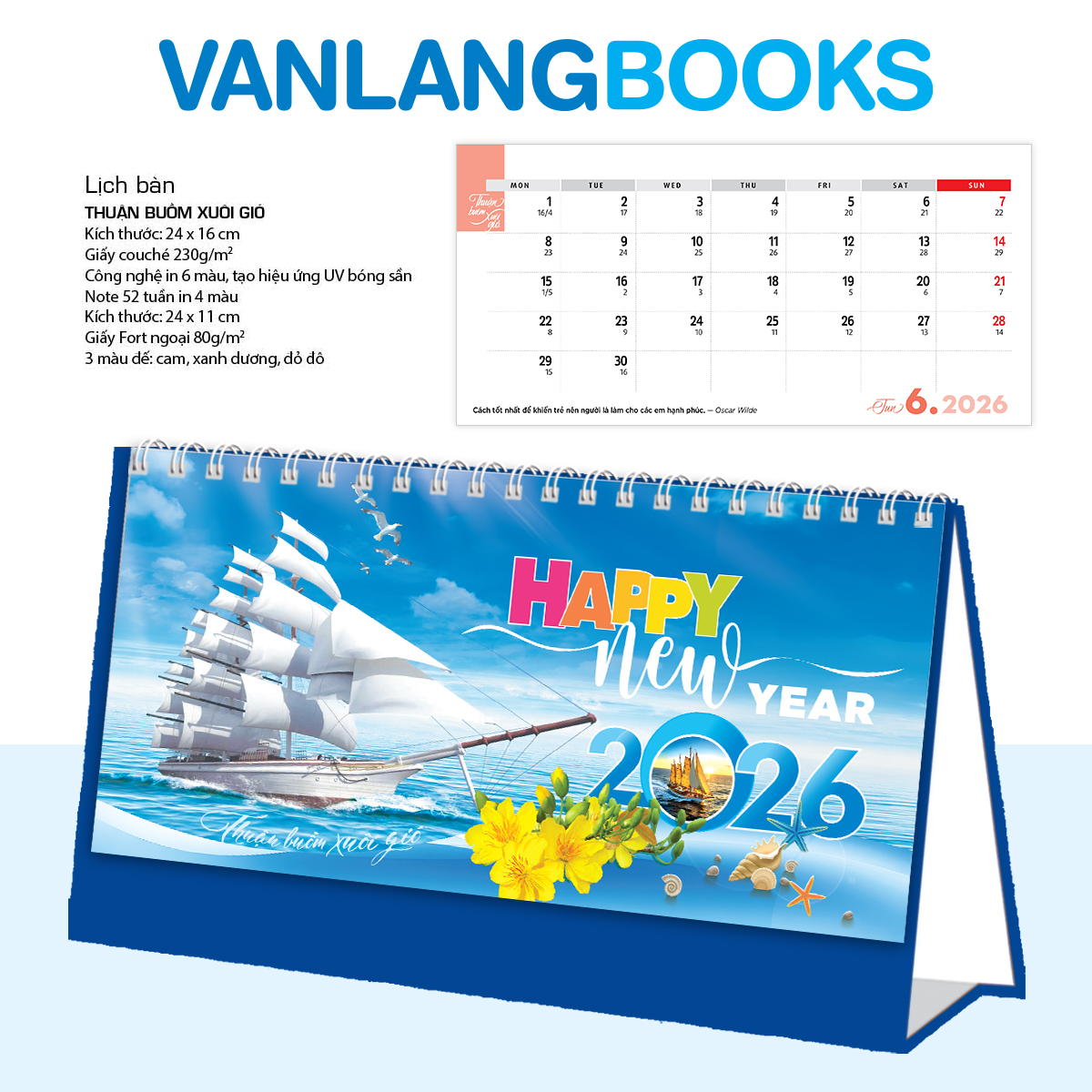 Chào đón năm mới với Lịch Bàn 1 lò xo chữ A Vanlangbooks 2026 chủ đề Thuận Buồm Xuôi Gió, một cuốn lịch mang theo ý nghĩa của sự may mắn, thành công và hanh thông trong mọi công việc. Hình ảnh những cánh buồm căng gió vươn ra biển lớn sẽ truyền cảm hứng cho bạn mỗi ngày. bạn có thể dễ dàng ghi chú và lên kế hoạch cho một năm bận rộn. Đây là món quà tặng Tết vô cùng ý nghĩa cho bạn bè, đối tác hoặc người thân.