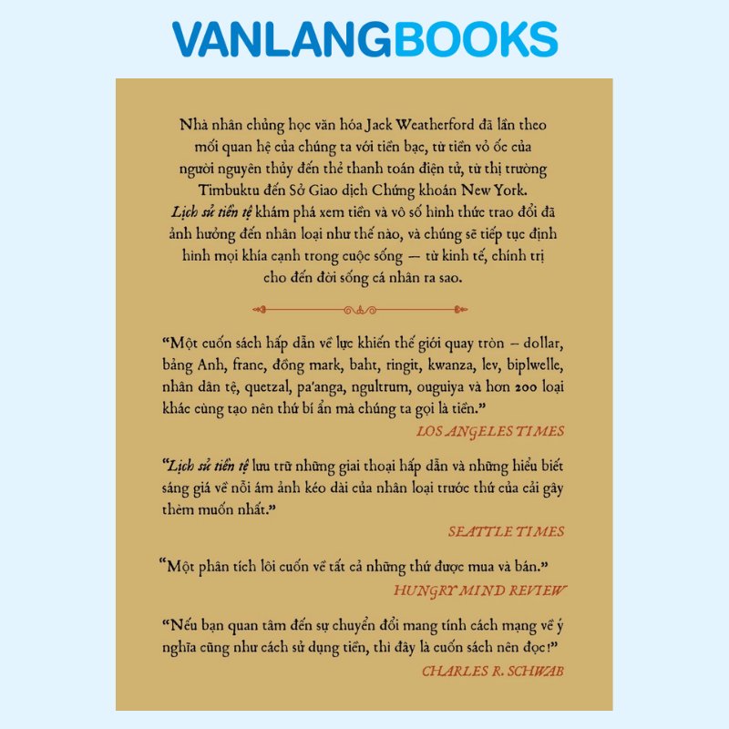 Lịch Sử Tiền Tệ là công trình nghiên cứu nổi tiếng của nhà nhân chủng học văn hóa Jack Weatherford, lần theo hành trình hình thành và phát triển của tiền bạc trong lịch sử nhân loại. Từ tiền vỏ ốc của các xã hội nguyên thủy đến tiền giấy, thẻ thanh toán và các hệ thống tài chính hiện đại, cuốn sách cho thấy tiền không chỉ là công cụ trao đổi mà còn là yếu tố chi phối kinh tế, chính trị, văn hóa và đời sống con người. Bằng lối viết mạch lạc, giàu tư liệu và mang tính kể chuyện, tác giả đưa người đọc đi qua các giai đoạn lịch sử quan trọng, khám phá cách tiền tệ định hình xã hội loài người và dự báo những biến đổi trong kỷ nguyên toàn cầu hóa và tiền điện tử.