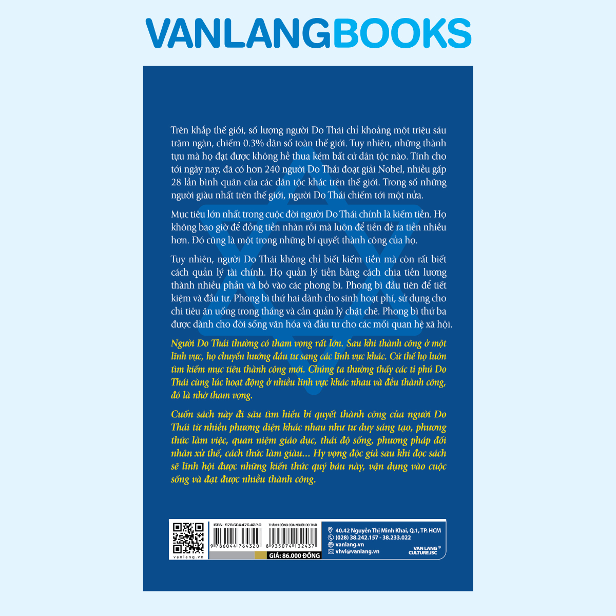 Thành Công Của Người Do Thái (Tái bản 2023) là một trong những cuốn sách truyền cảm hứng sâu sắc về tư duy làm giàu, giáo dục và lối sống của một trong những dân tộc được xem là thông minh và thành công nhất thế giới. Dù chỉ chiếm 0.3% dân số toàn cầu người Do Thái lại nắm giữ đến một nửa danh sách những người giàu nhất thế giới, một minh chứng mạnh mẽ cho trí tuệ và chiến lược sống vượt bậc của họ. Vậy điều gì đã giúp họ đạt được thành tựu phi thường ấy? Cuốn sách này chính là chìa khóa hé lộ những bí mật thành công không chỉ trong kiếm tiền mà còn trong cách quản lý, đầu tư và mở rộng tri thức mà bất kỳ ai cũng có thể học hỏi và áp dụng.